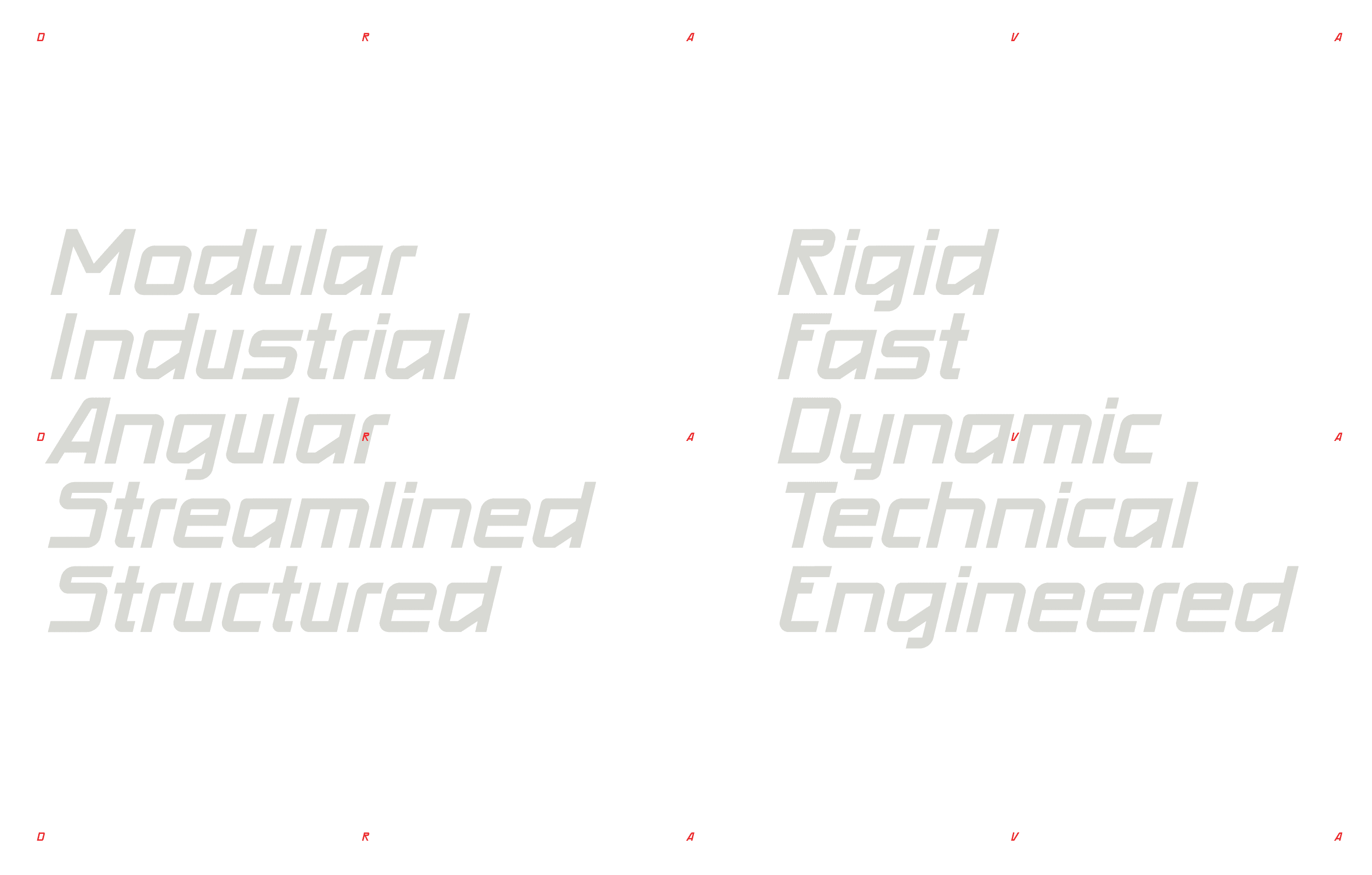 DRAVA is a bold, modular typeface designed for motion and precision. Its boxy forms and angled construction draw from the energy of speed and the discipline of technology, creating letterforms that feel both controlled and dynamic.